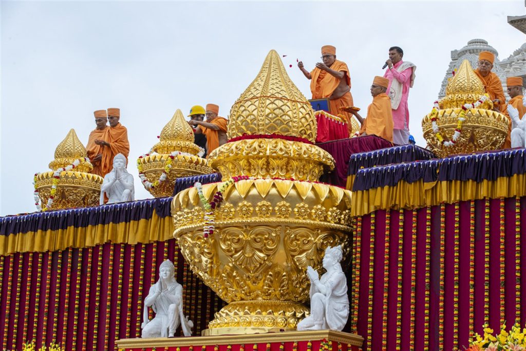 For hundreds of volunteers, August 30, 2023, marked a momentous occasion in the building of BAPS Swaminarayan Akshardham in Robbinsville, New Jersey. The Kalash, or topmost part of the mandir’s pinnacle, was sanctified during the sacred Kalash Pujan. With joyous tears, the volunteers watched as their years of hard work and anticipation culminated in the pinnacle point of the mahamandir by His Holiness Mahant Swami Maharaj. Senior swamis joined the auspicious ceremony to sanctify 18 kalashes for the spires of Akshardham. The kalash is the peak of the shikhar, or spire, which signifies blessings and the pursuit of spiritual immortality.…